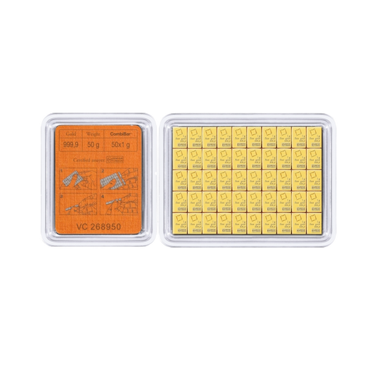 50 x 1g Valcambi Švajčiarsko Investičné zlaté tehličky (CombiBar)